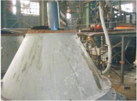 茶壶包烘烤器立式AOD炉烘烤器分为仰角启闭式的和左右摆动式两种,仰角启闭式是将燃烧器固定在一个悬臂上,为了防止热量的散失。罐口上加一罐盖,将热量尽可能 的控制在罐内,同时也可以保护燃烧器不被烧毁。延长其使用寿命,左右摆动式AOD炉烘烤器是通过回转支撑的摆动,使悬臂风管和燃料管在支架上可以和罐盖一起运动,对不同工位的AOD炉进行烘烤。